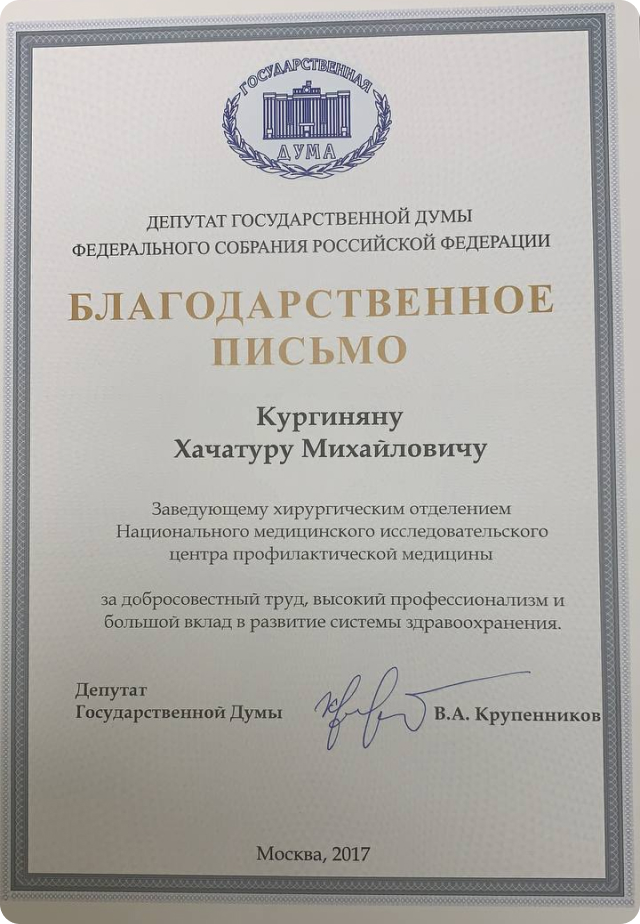 Благодарственное письмо от Государственной Думы