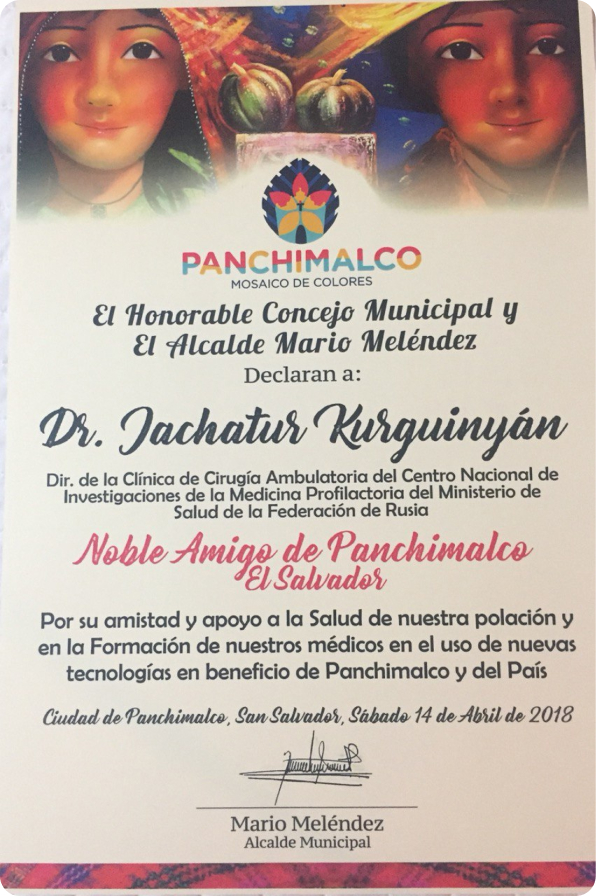 Благодарственное письмо от правительства республики Сальвадор за вклад в развитие здравоохранения республики.