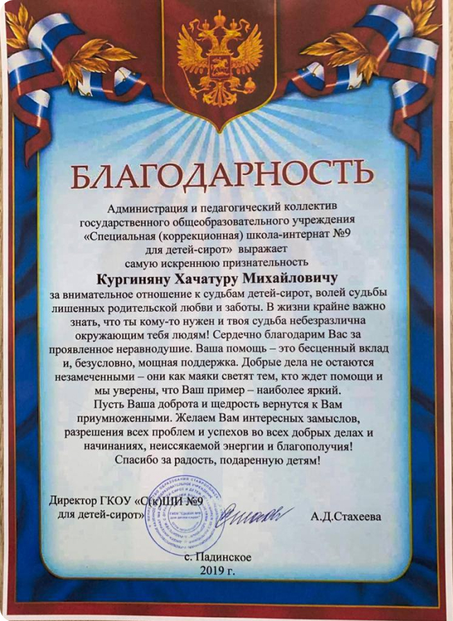 Благодарственное письмо от специальной школы для детей сирот